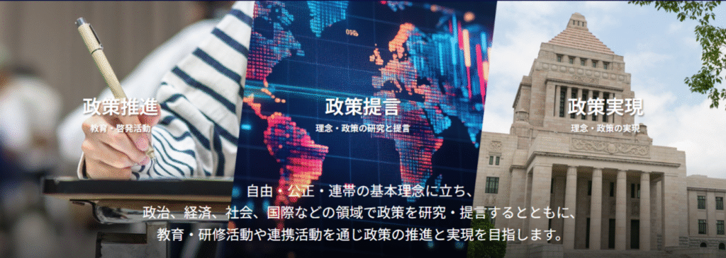 自由・公正・連帯の基本理念に立ち、政治・経済・社会・国際などの領域で政策を研究・提言するとともに、教育・研修活動や連携活動を通じ、政策の推進や実現を目指します。